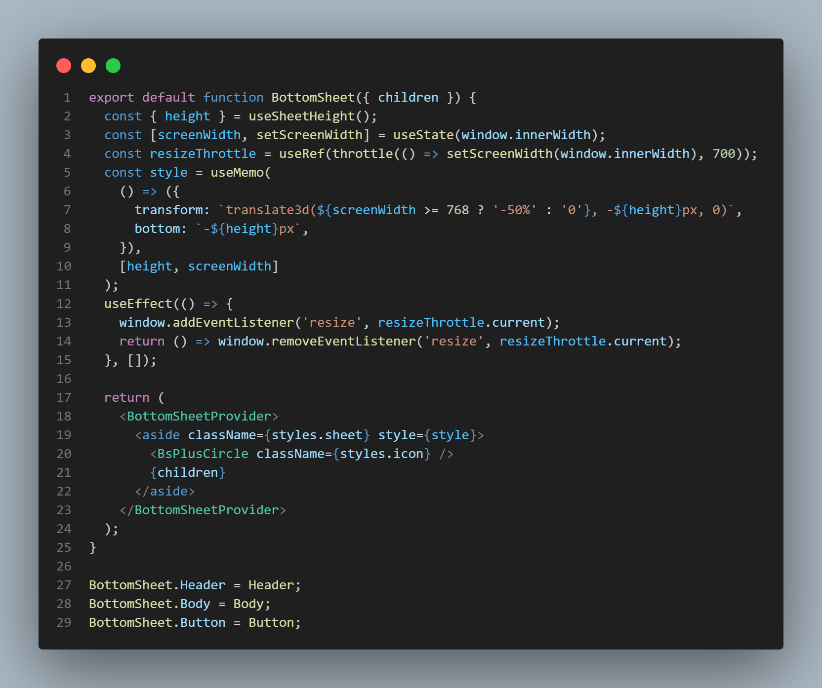 2~ 15๋ฒ์งธ ์ค์ BottomSheet ์ ๋๋ฉ์ด์ ๋ฐ ๋ธ๋ผ์ฐ์ resize ์ด๋ฒคํธ์ ๊ดํ ๋ก์ง์ ๋๋ค.