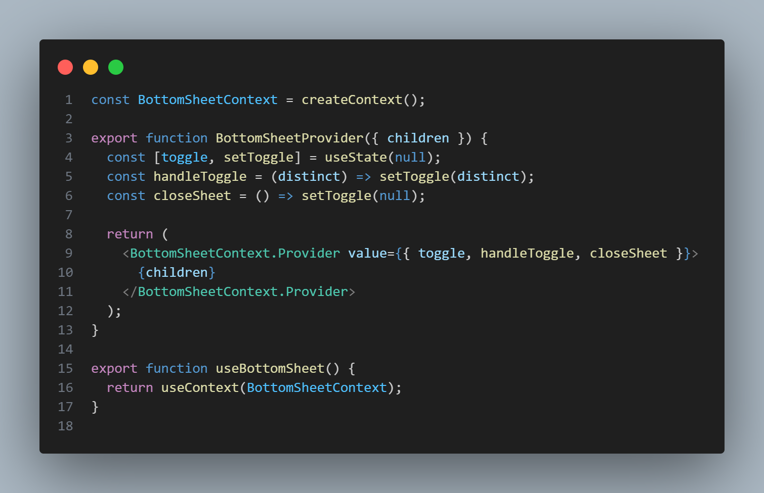 BottomSheetContext๋ ์ด๋ค Form์ด ๋ ๋๋ง ๋๋์ง ๊ฒฐ์ ํ๋ toggle ์ํ๋ฅผ ๊ฐ์ง๊ณ ์์ต๋๋ค.