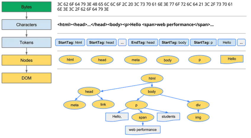 ๋ฐ์ดํธ → ๋ฌธ์ → ํ ํฐ → ๋ ธ๋ → DOM