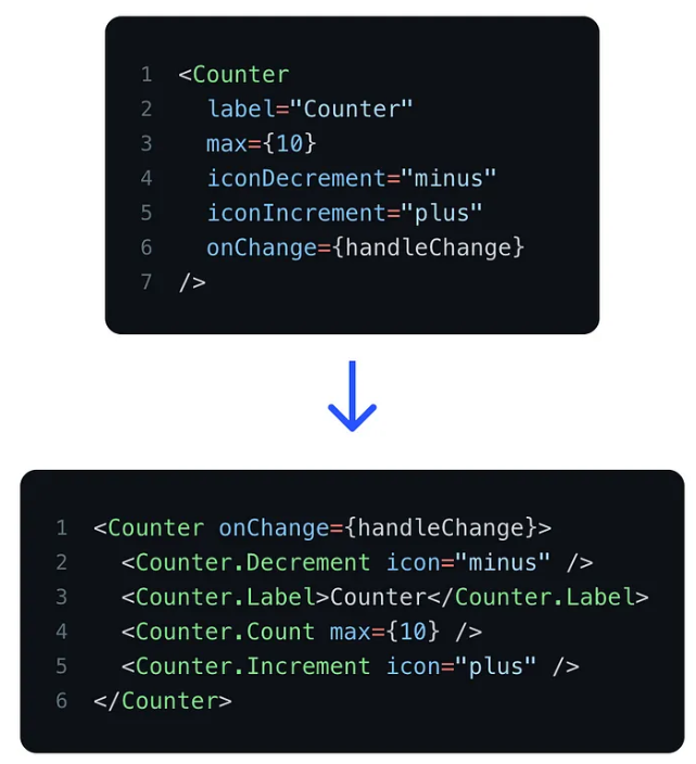 단점: UI의 높은 유연성 때문에, 필수 자식 컴포넌트의 누락 등 예상하지 못한 결과가 발생할 수 있고, JSX 행이 길어질 수 있습니다.