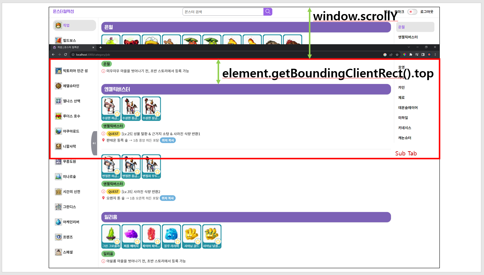 - scroll 이벤트 시, 각 Tap Panel 위치에 도달하면 해당 하는 Sub Tab Item이 active 상태가 된다.